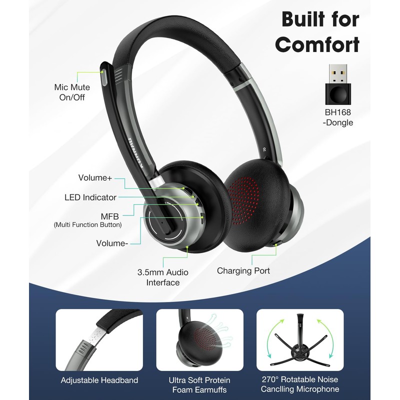 - 【5oz Lightweight, Comfortable to Wear】The wireless headset for work is ultra-light, weighing just 5oz, so it won't put pressure on your head when wear for long periods of time. The soft protein memory foam ear pads are made of high-quality breathable material, which can effectively protect the ears from heat and sweat. The adjustable headband and 90°rotatable earcups can better fit your head, even when wearing glasses. And, the 270°rotatable microphone can be placed on the right or left.