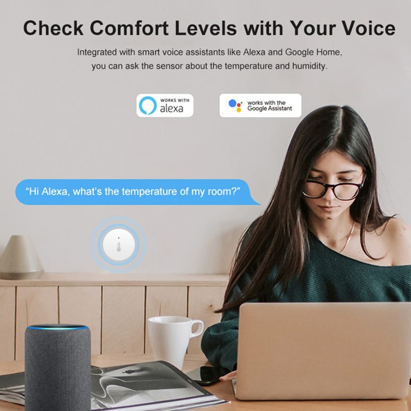 - THIRD-PARTY VOICE CONTROL & FREE DATA STORAGE EXPORT: indoor thermometer digital supports Alexa and Google smart speaker. You can know the temperature or humidity by voice. "Alexa, what's the temperature of Device Nane" Our smart temperature sensor uploads data to the App. Enjoy the online data storage view and export up data seen through clear historical trends and graphs.