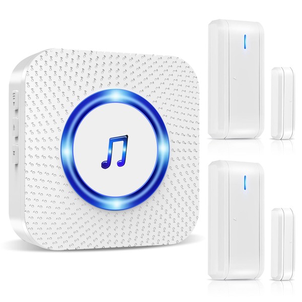 - 【Wide Working Range Door Alert Sensor】:2 Secure Contact Sensors, 1 Doorbell Plugin Receiver.This wireless door open chime for home is up to 400 ft in open area, magnetic door sensor alarm will automatically trigger the receiver when the magnetic strip is separated and the receiver will alerts immediately whenever the door or window is opened.