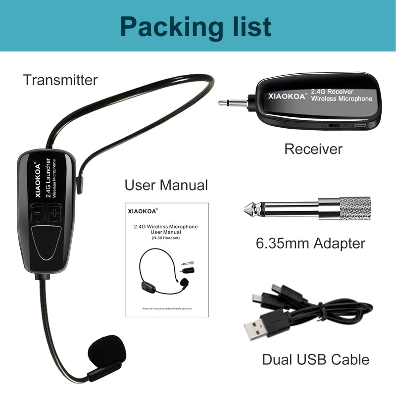 XIAOKOA 2.4G Wireless Microphone Headset, 50m Stable Transmission, Dual Micro USB Charging, Compatible with PA Systems
