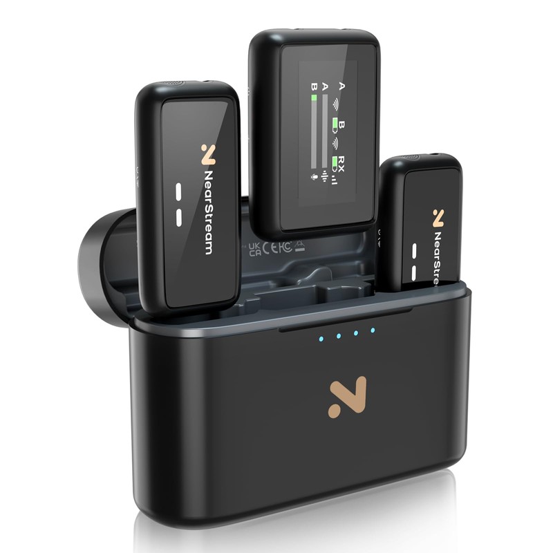 - "Ultra Compact 3-In-1 Wireless Microphone" The NearStream AWM20T consists of 1 receiver and 2 transmitters or 1 charging/storage case for a compact and versatile wireless labellia microphone system. Convenient to store and carry. Take out the receiver and pair it automatically with the transmitter, making it easy for beginners. The unique clip on closure makes it easy to attach to your garment and perfect for a variety of content creations. This wireless pin microphone unleashes the creator's creativity when you are talking videos, such as moving your hands, walking or taking photos while moving