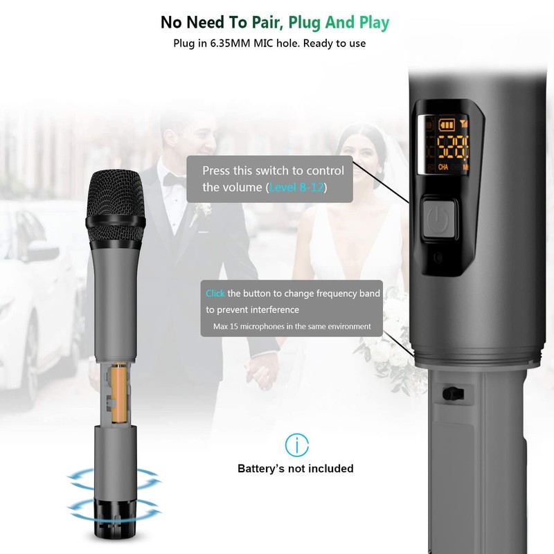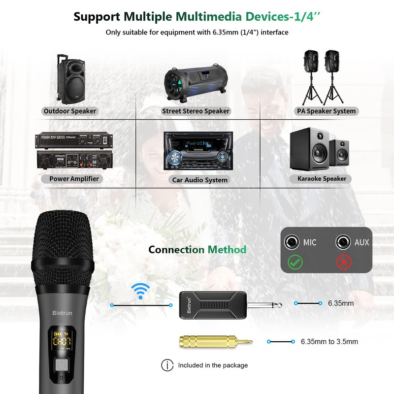 Bietrun Wireless Microphone Only for Mic Input, UHF Metal Dynamic Handheld Multipurpose Mic with Rechargeable Receiver (Work 4hs), 160ft Range, for Karaoke Machine, Amplifier Speaker, Mixer, Church