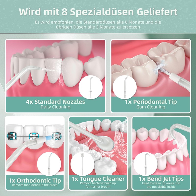 - 8 attachments for the whole family: the set includes 8 nozzles that are adapted to different dental and gum needs. Thus, the dental rinse is suitable for the entire family - also for wearers of braces or bridges