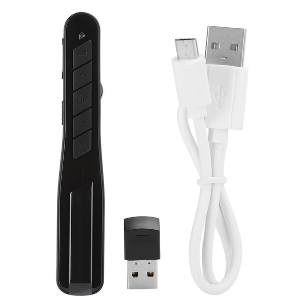 1、Adopts 2.4G wireless technology with built‑in laser head, multi‑function buttons supports PPT page turning function, gravity sensor and RF wireless technology combined to achieve the perfect combination of mouse and presentation functions. 2、Built‑in USB interface is plug and play to keep simple operation, easy to use with laser indication function, which is worth having. 3、Ergonomic design helps wireless presenter with comfortable feel, smooth and durable. 4、With the most advanced RF radio frequency technology, micro‑power transmission, there is harmless to the human body, which can be environmentally friendly, healthy, environmental protection and power saving. 5、Supports 6‑shaft gyro technology gravity sensor positioning with mouse function for USB receiving.
