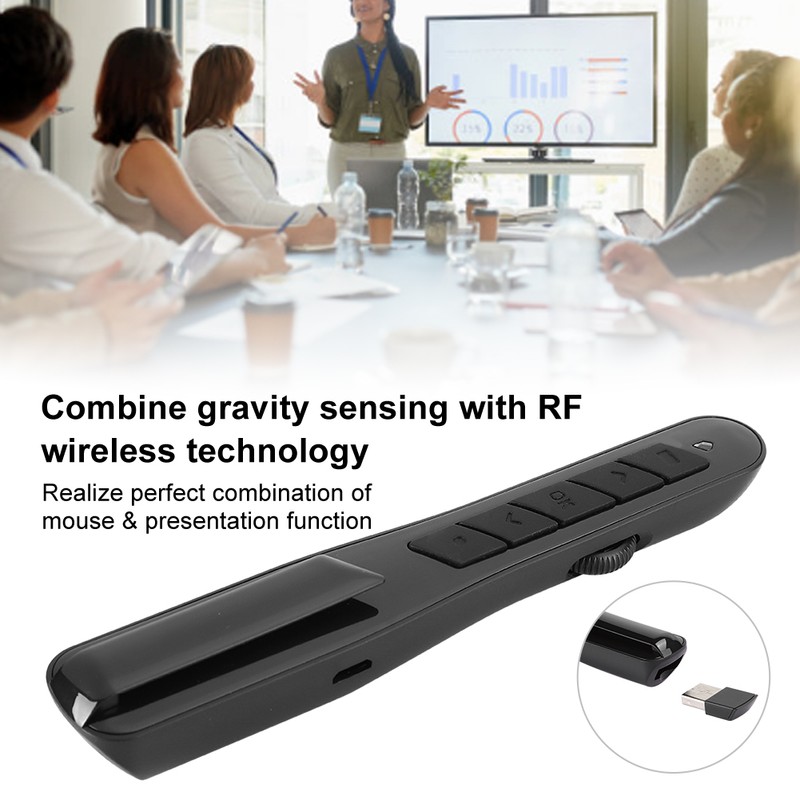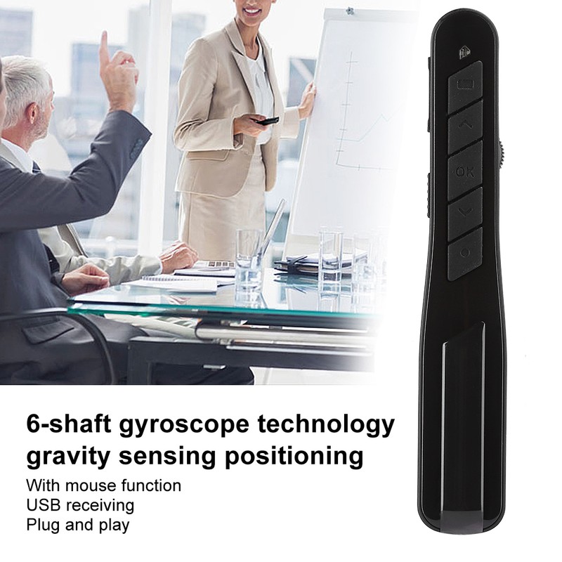 1、Adopts 2.4G wireless technology with built‑in laser head, multi‑function buttons supports PPT page turning function, gravity sensor and RF wireless technology combined to achieve the perfect combination of mouse and presentation functions. 2、Built‑in USB interface is plug and play to keep simple operation, easy to use with laser indication function, which is worth having. 3、Ergonomic design helps wireless presenter with comfortable feel, smooth and durable. 4、With the most advanced RF radio frequency technology, micro‑power transmission, there is harmless to the human body, which can be environmentally friendly, healthy, environmental protection and power saving. 5、Supports 6‑shaft gyro technology gravity sensor positioning with mouse function for USB receiving.