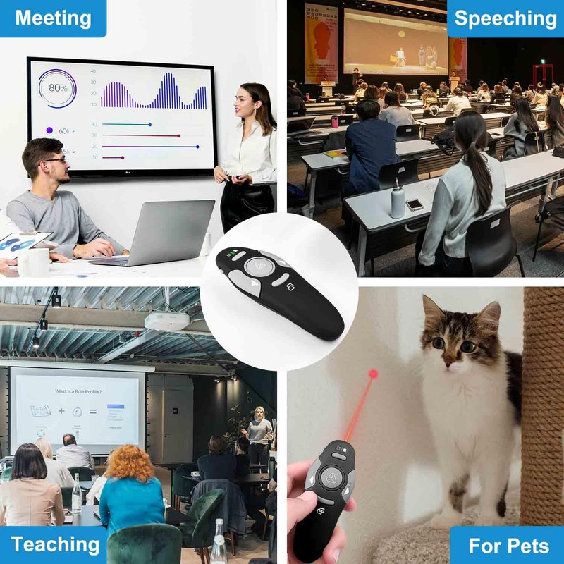 - 【Plug & Play 2.4GHz Wireless Presenter】Our wireless presentation clicker just Plug and Play, don’t need to download software (For mac, you may need to complete an easy set-up first). This pointer for presentations supports page backward/forward, black/full screen. A best office presentation remotes computer clicker projector remote for teachers speakers etc.,