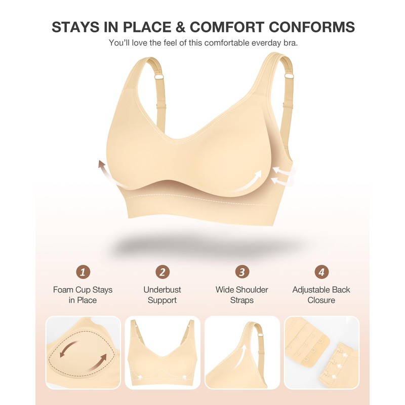 - Seamless Support Bra, The integrated fixed pad design ensures no shifting or cup slippage in any state. This everyday bra provides comprehensive coverage and support, suitable as an everyday bra, T-shirt bra, post surgical bra, or light sport bra for casual daily wear. Whether lounging at home, dressing for the office, or going out on weekends, it easily adapts to various life scenarios. This wireless everyday bra is your ideal choice.