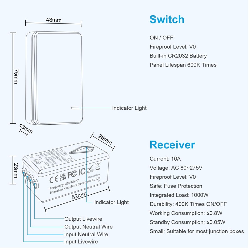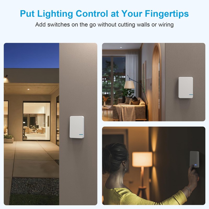 - High quality and safety: this wireless switch features high-quality, fire protection, IP66 waterproof for safe use. You can simply use it as a new additional switch to renovate homes or modify existing switches without cutting walls or laying cables. Save time and money and be environmentally friendly. Please note: this item must work with a receiver (not included).