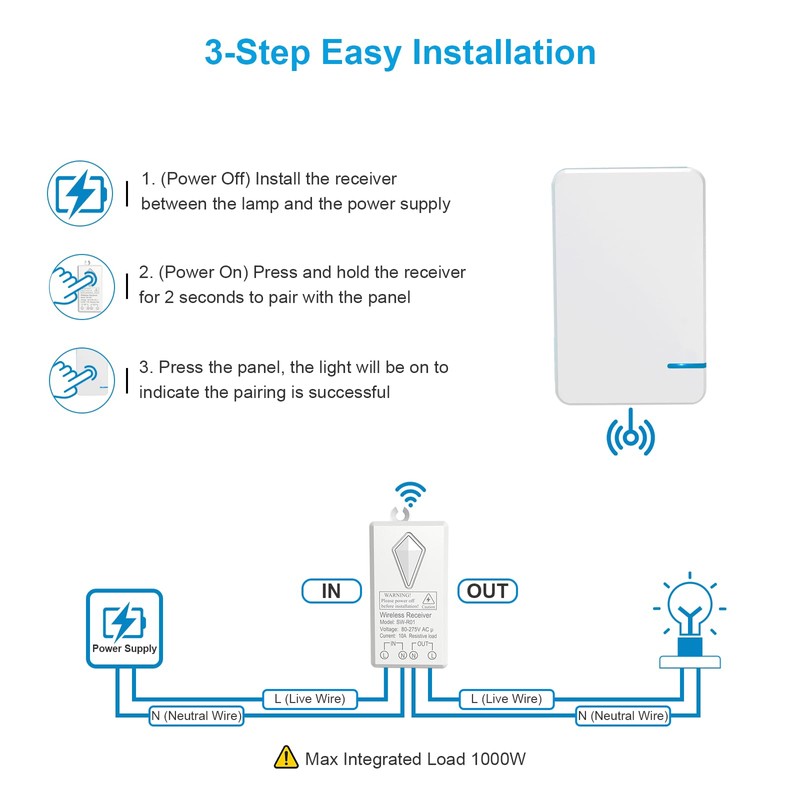 - Applicable devices: wireless switch fits almost all lamps, including halogen lamps, incandescent lamps, fluorescent lamps, LED lighting, fans and other electrical switching devices, etc. Max. Built-in power: 1000W.