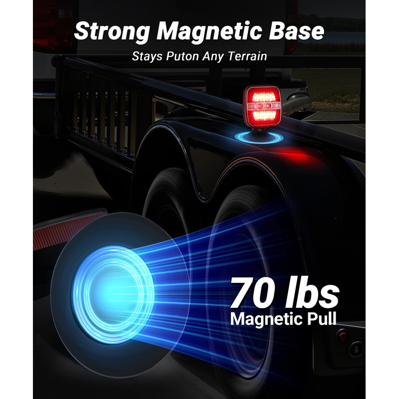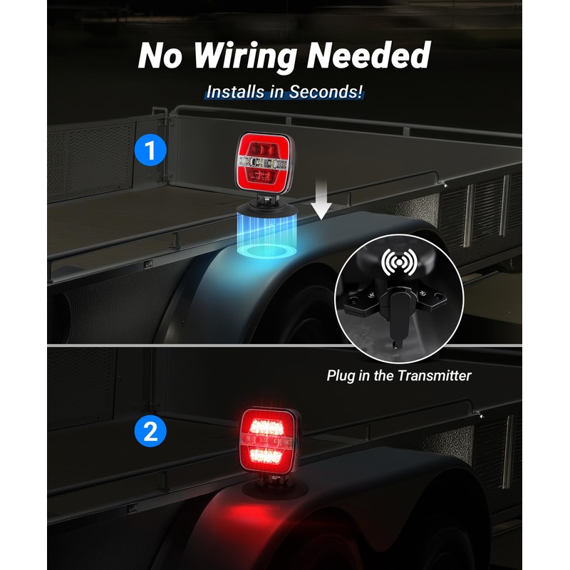 - Wireless Magnetic Trailer Lights. These lights feature a 7-to-4-way transmitter with a 100 ft wireless range, making them ideal for trailers or towed vehicles of any length. Equipped with strong, rubber-coated magnets, they securely attach to any metal surface while helping protect your vehicle’s paint from scratches or damage.