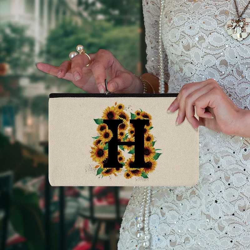 WIRESTER Canvas Zipper Makeup Bag, Cosmetic Pouch, Organizer Case for Women Girl, Multi-Purpose Travel Cosmetic Bag - Black Letter H Alphabet Sunflowers