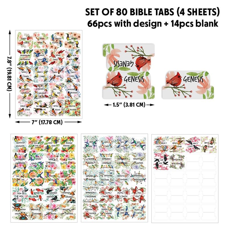 WIRESTER Large Print Laminated Bible Tabs, 80 Bible Index Tabs (66 Book Tabs and 14 Blank Tabs) Easy to Read and Navigation, Bible Journaling Supplies, Cute Bible Label Tabs for Women Men - Birds