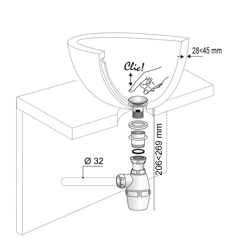 - Sink drain with integrated overflow Stainless steel Quick-clac valve or white ABS valve Height adjustable siphon 1"1/4 Inlet Ø32 mm screw