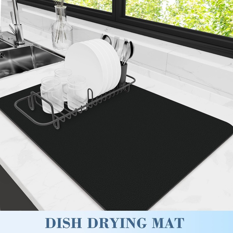 WISELIFE 2-PACK Dish Drying Mat (16" x 24" Classic Black) Large Draining Mat Super Absorbent Dish Drying Mats for Kitchen Counter Rubber Backing Kitchen Drying Mat