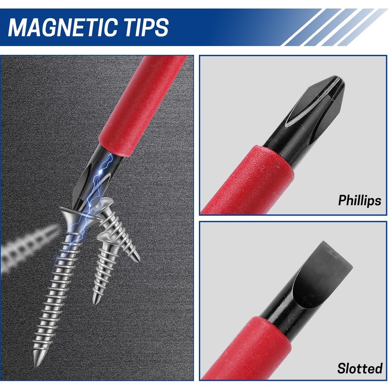 - Anti-rolling Compound Handles & Premium Metal: Ergonomic PP & TPE handles providing increased comfort and maximized torque for driving and loosening fasteners, special handle design prevents rolling during work.CRV construct Phillips and SUP11 construct slotted blades tips, ensure maximum strength and durability, electroplating head for increased corrosion resistance.