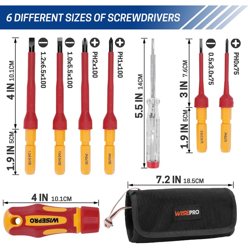 - Multi Interchangeable Blades Tips: The VDE screwdriver set contain 6 interchangeable head, Phillips #1x4", #2x4", #0x3", slotted 1/4"x4", 7/32"x4", 1/8"x3".an electric mains tester screwdriver is provided for additional use. allowing varying applications with a single driver.