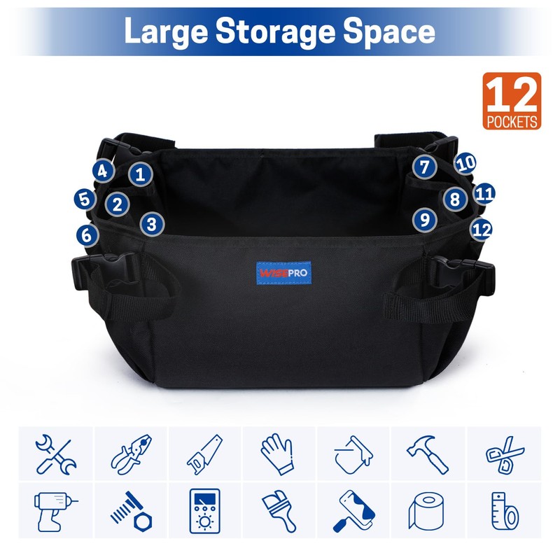 - Large Capacity: Equipped with a spacious main storage compartment and 12 side tool pockets, the tool pouch easily holds screwdrivers, wrenches, drills, and other hand and power tools. Its organized design allows for easy access and quick retrieval.