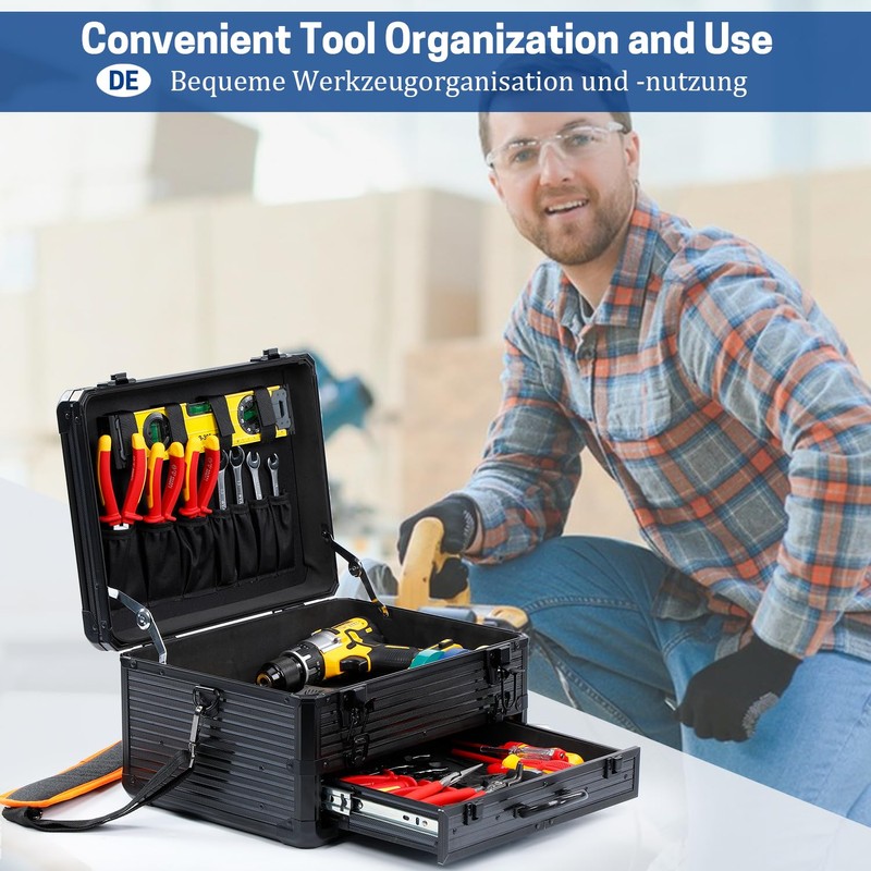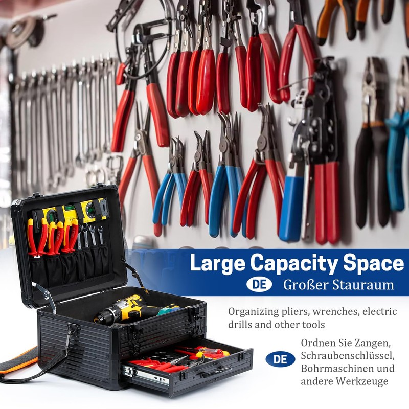 - Dual Security Latches: Both the top of the tool storage box and the drawer are equipped with dual security latches. This prevents the case and drawer from accidentally opening during movement or transportation. It effectively protects the tools and items, allowing you to use it with greater peace of mind.