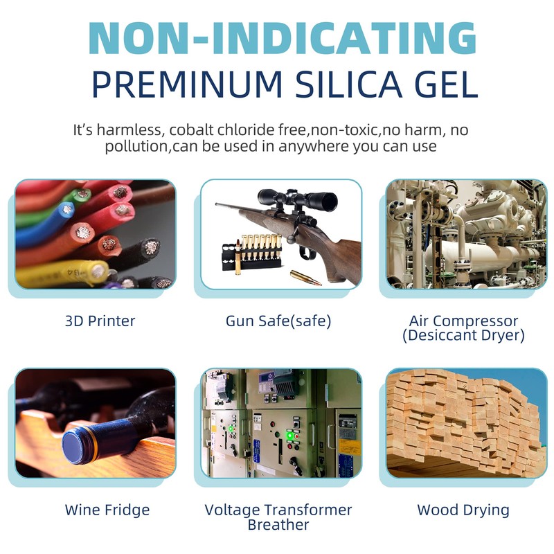 - 【Versatile Application】: White silica gel is widely used to protect various enclosed storage spaces including safes, ammo cans, toolboxes, 3D printer filament storage boxes, weapon cases, closets, and more. With white silica gel, you can effectively prevent moisture damage to guns, important documents, collectibles, books, jewelry, photo albums, shoes, camera lenses, toys, leather clothing, ammunition, photo equipment, and air dryer systems.