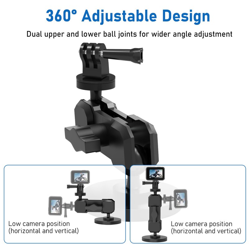 - 360° Adjustable Dual Head Gimbal - This magnetic mount features a 360 degree rotating double ball head that can be adjusted up and down, vertically and horizontally for flexible shooting. With the 1/4" thread on the top, the camera can be attached directly to a stabiliser or threaded hole. So you can fix the camera at the perfect angle to take the best shots.