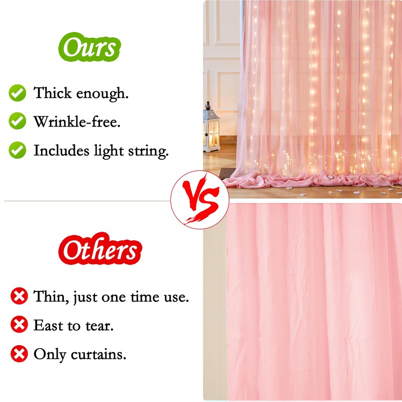 - Material: The light pink curtain backdrop with lights are made of premium chiffon fabric, drapes beautifully and elegantly, creating a more warm, romantic, cheerful, and relaxed atmosphere. More sturdy than tulle fabric backdrop, easy to care
