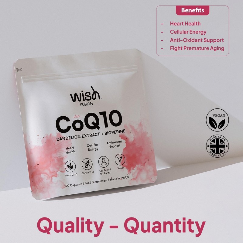 Elevate your wellness with Wish Fusion CoQ10 Heart & Energy Support, a premium supplement featuring 120 vegan capsules crafted in the UK. Formulated with CoQ10 ubiquinone, this powerful antioxidant promotes heart health and boosts energy production while combating oxidative stress. Enhanced with BioPerine for superior absorption and dandelion for natural detoxification, these capsules deliver comprehensive support for your vitality. Perfect for daily use, this vegan-friendly formula ensures you maintain optimal heart and cellular health with every dose.