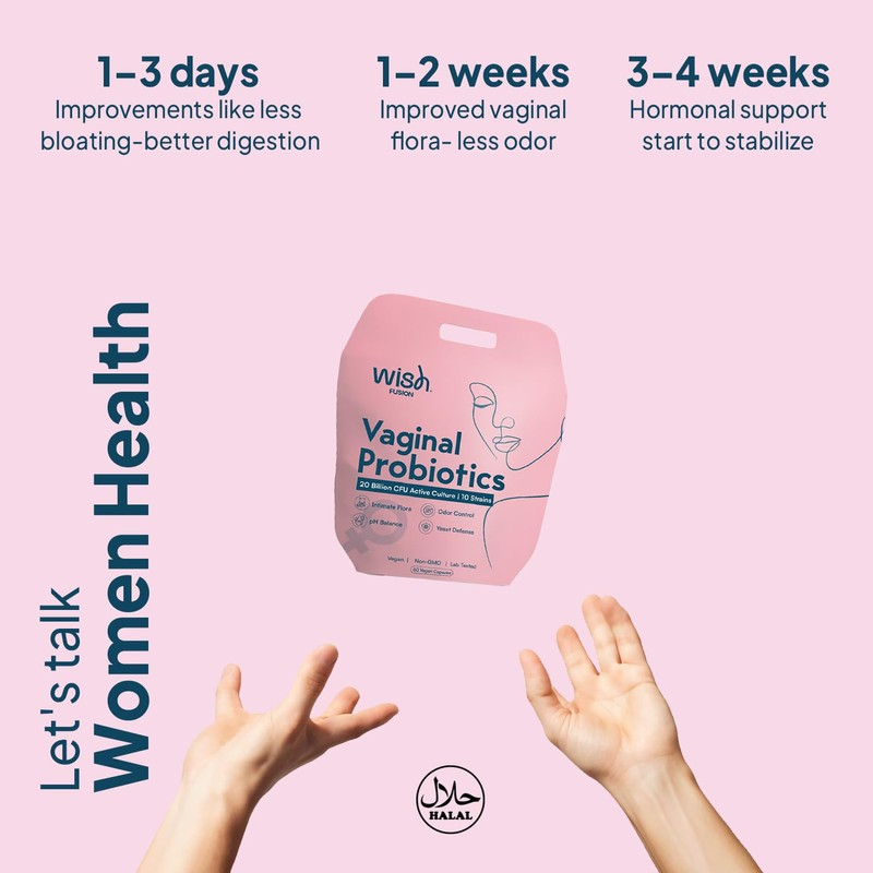 Product description Wish Fusion Vaginal Probiotics - 20 Billion CFU | 10 Powerful StrainsSupport your feminine health with Wish Fusion Vaginal Probiotics, expertly formulated with 20 Billion CFU active cultures and 10 clinically researched probiotic strains. Designed to help restore balance, fight odor, support yeast defense, and maintain a healthy pH level all in one easy-to-take daily capsule. Key Benefits:Maintains Intimate Flora: Helps restore and sustain a healthy vaginal microbiome for everyday freshness and comfort. Promotes pH Balance: Supports optimal vaginal pH to help reduce irritation, itching, and dryness. Odor Control & Yeast Defense: Naturally supports odor and yeast control without synthetic ingredients. Lab-Tested & Vegan: 100% vegan-friendly, Non-GMO, soy-free, and gluten-freelab-tested for safety and quality. 60 Vegan Capsules: One-month supply in a convenient resealable pouch. Easy to swallow and gentle on the stomach. Why Choose Wish Fusion?Our probiotics are developed by experts and manufactured in a certified facility with strict quality standards. Each batch is lab-tested to ensure the highest potency and purity for your peace of mind.Empower your feminine wellness today with Wish Fusionwhere health meets confidence.IngredientsLactobacillus rhamnosus, Lactobacillus reuteri, Lactobacillus fermentum, Lactobacillus acidophilus, Bifidobacterium lactis, Lactobacillus plantarum , Xylooligosaccharides (XOS), D-Mannose, Pineapple Powder, Cranberry Extract, Galacto-oligosaccharides (GOS), Vitamin C (Ascorbic Acid)
