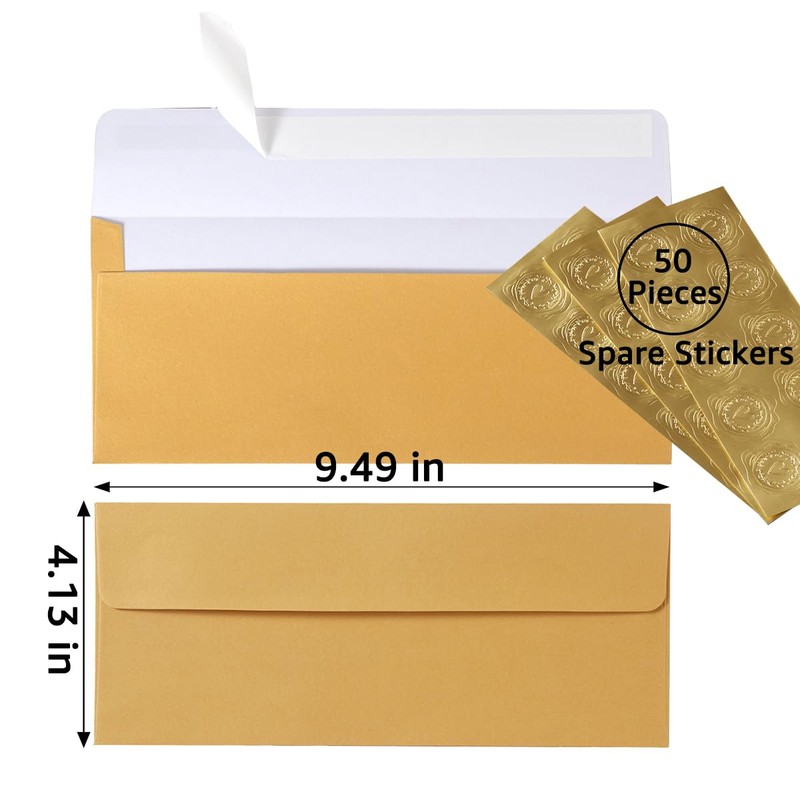 Wishop 50 Pack Shiny #10 Business Envelopes Self Seal Standard Envelopes with Gold Stickers for Office Checks, Business Cards, Letter Mailing Invoices, 4.13 x 9.49 Inches (Gold)