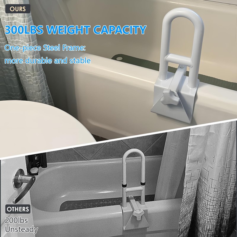 - Durable and Strong Construction: Constructed with a high-strength carbon steel frame, our bathtub handles are designed for durability and stability. With a one-piece steel frame and a load-bearing capacity of up to 300lbs, the safety rail offer corrosion resistance and long-lasting use, making them ideal for elderly or disabled individuals