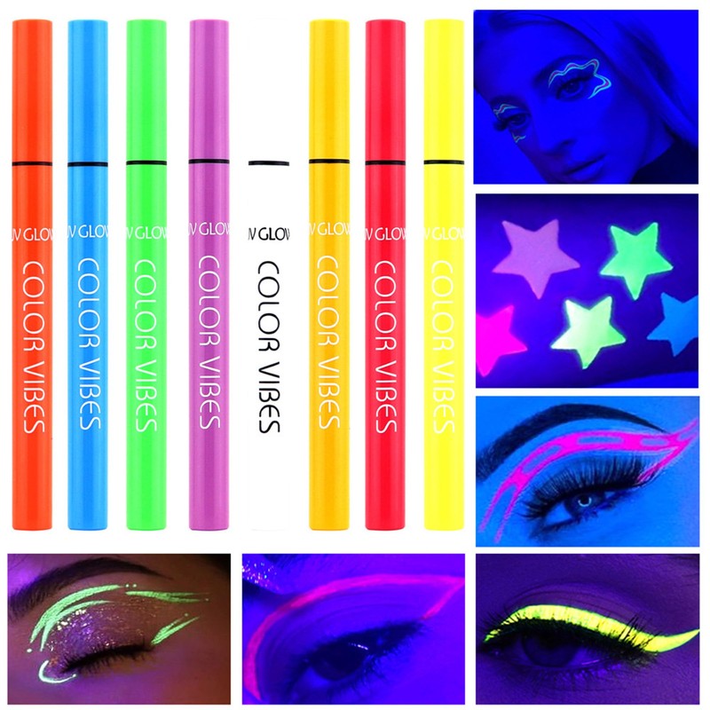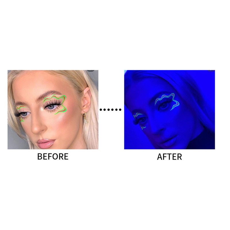- UV GLOW EYELINER - There is fluorescence in the liquid eyeliner, and it will have a fluorescent effect under the irradiation of the ultraviolet lamp. The color of the liquid eyeliner under normal light or sunlight is as shown on the package.