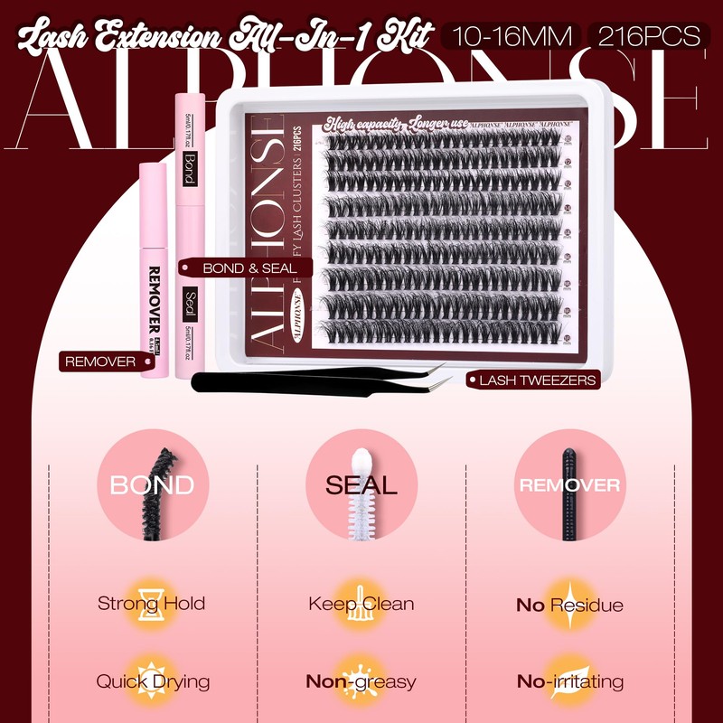 - All-In-1 Individual Lashes Kit: In this kit, you will get 216pcs fluffy lash clusters, 1*bond and seal lash glue, 1*lash remover, 1*tweezers. For DIY lashes extension at home.