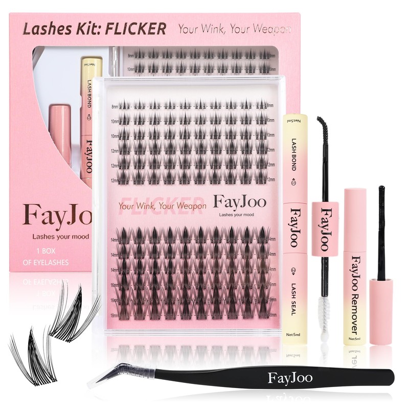 Wispy Spiky Soft Lash Clusters Kit, C Curl 8-18mm, Thin Fiber with 0.05mm Invisible Band, DIY Salon Eyelash Extension Kit with Bond Seal Remover Tweezers, Lightweight, Natural Glam, FLICKER 11 Kit