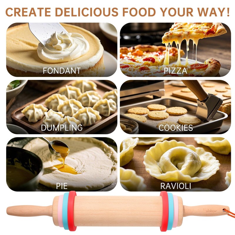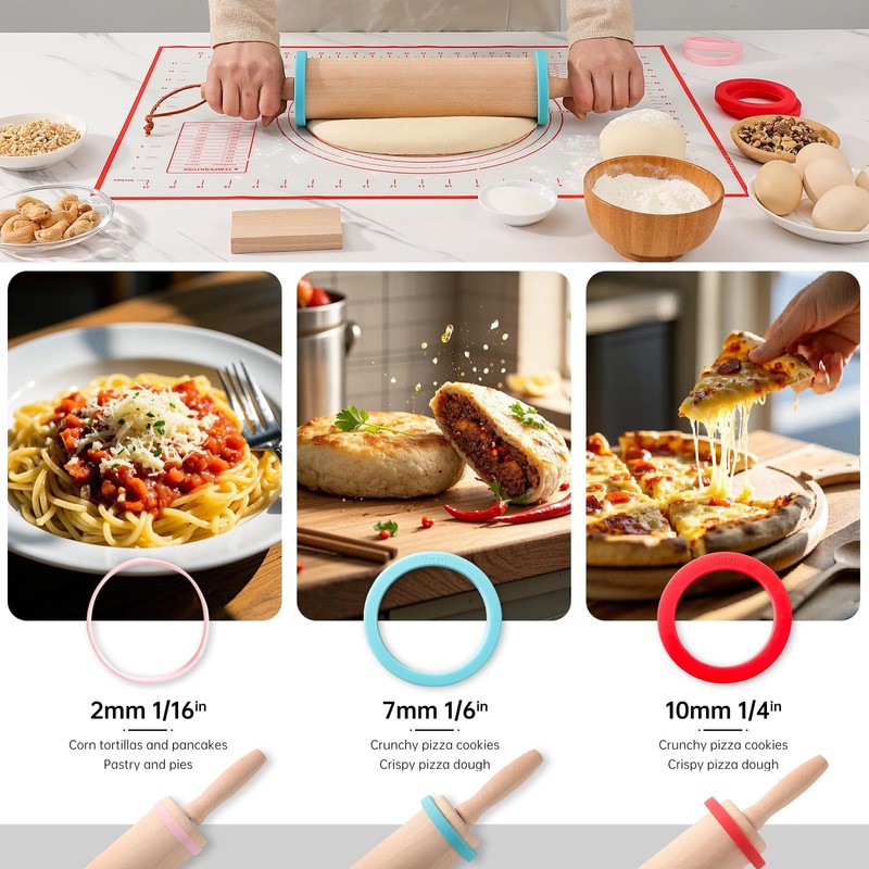• Three thicknesses of rolling pin rings adjust the thickness of baked food and pastry dishes. 10mm rings are for pizza, 7mm for cookies and 2mm for dumpling skins and other delicious food pastry skins.