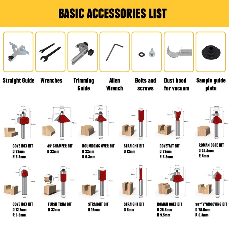 - Everything You Need: We provide 12-month warranty service to give you most guarantee. electric wood jointer comes with rich accessories: 12 woodworking router bits, 1 x trimmer guide, 1 x straight guide, 2 x wrenches, 1 x allen wrench, bolts and screws, sample guide plate, dust hood for vacuum