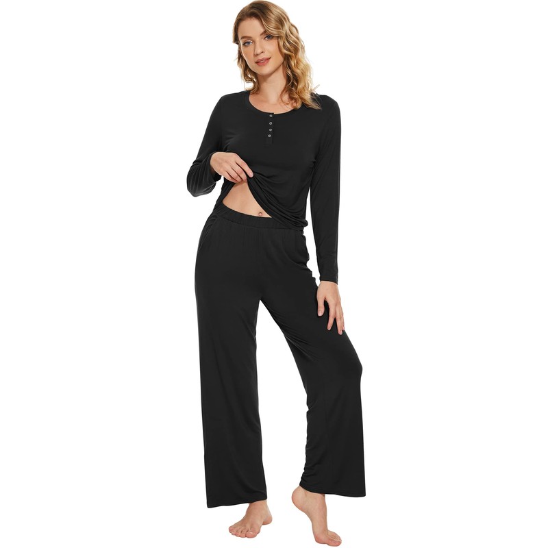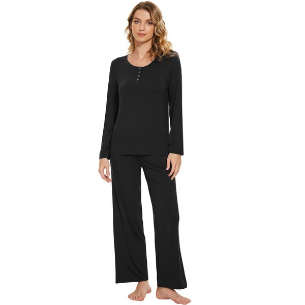 WiWi Viscose from Bamboo Pajama Set for Women 2 Pieces Long Sleeve Loungwear Soft Sleepwear Loose Comfy Pj Sets Pockets S-XXL, B-black, Small