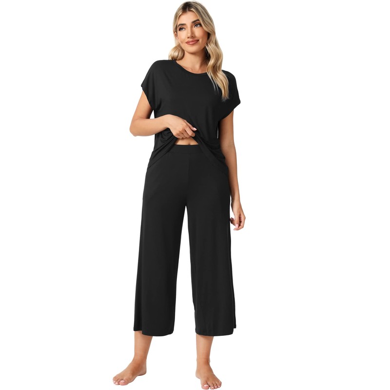 WiWi Viscose from Bamboo Pajamas Set for Women Soft Short Sleeve Top with Capri Pants Sleepwear Summer S-XXL, Black, Medium