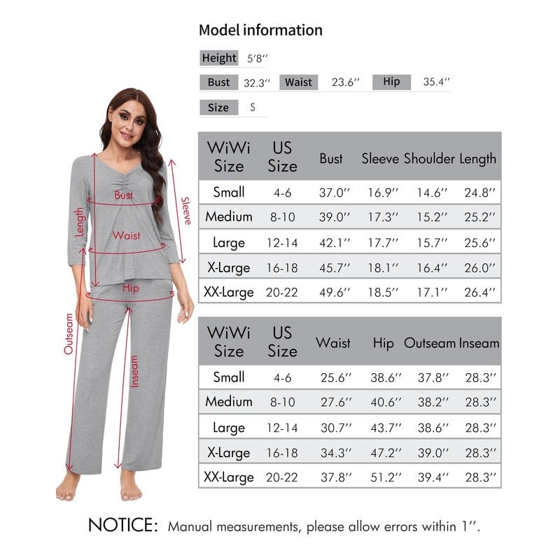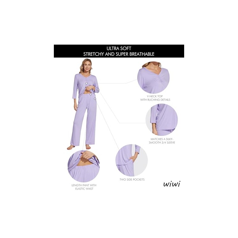 - HIGH QUALITY MATERIAL: WiWi viscose from bamboo 3/4 sleeve pajama set is made of high quality material, it is really soft, breathable, good at sweat absorption, soft to the touch, stretchy and skin friendly. These pajamas are lightweight but not see-through.