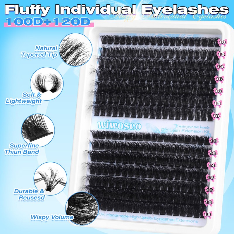 wiwoseo Fluffy Individual Eyelashes Kit 100D+120D Lash Extension kit Russian Lashes Individual Cluster Lashes Kit Volume Eyelash Extension Kit with Lash Bond and Seal Lash Glue for Beginners (10-18MM)