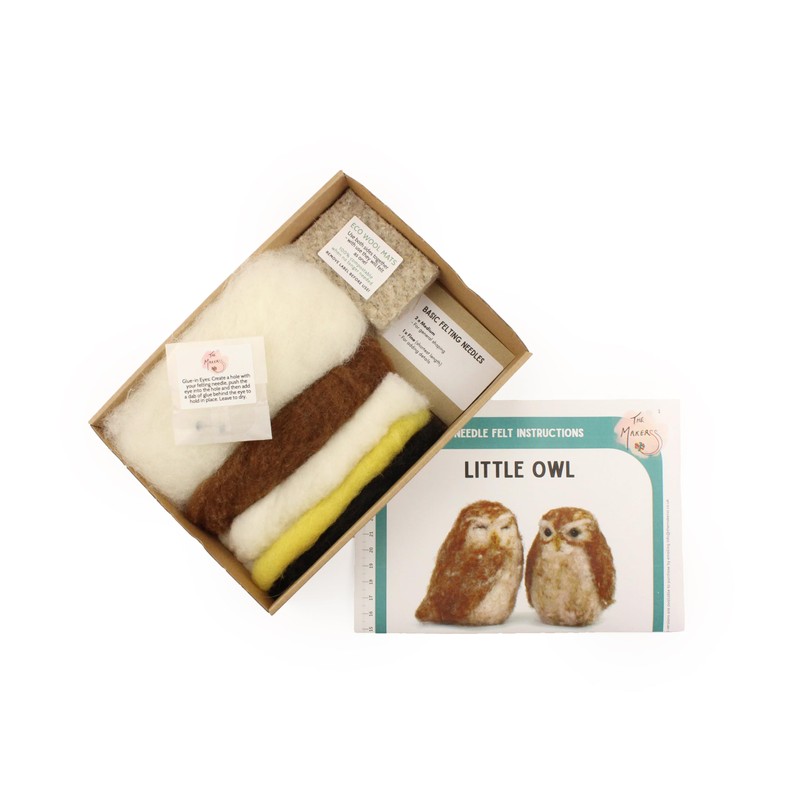 • Package contents: Full colour, step-by-step instructions 5 different types of wool 1 pair of 4mm Black Glue-In Eyes Felting needles (#38 medium, #40 Fine) Eco Wool Felting Mat (made from recycled wool and 100% compostable) You will also need: PVA clear drying glue. Designed and packaged in the UK using ethically sourced and eco-friendly materials.