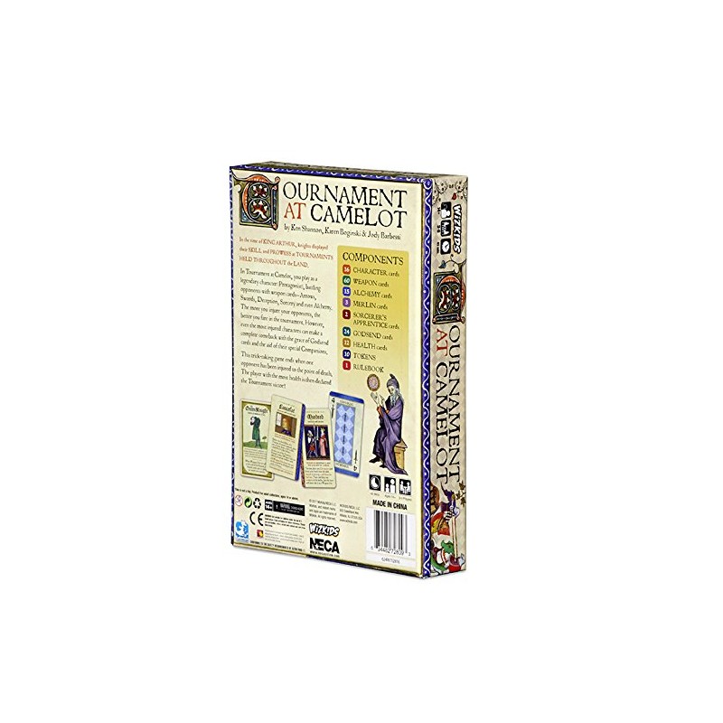 In the time of King Arthur, knights displayed their skill and prowess at tournaments held throughout the land. In Tournament at Camelot, you play as a legendary character (Protagonist), battling opponents with weapon cards—Arrows, Swords, Deception, Sorcery and even Alchemy. The more you injure your opponents, the better you fare in the tournament. However, even the most injured characters can make a complete comeback with the grace of Godsend cards and the aid of their special Companions. This trick-taking game ends when one opponent has been injured to the point of death. The player with the most health is then declared the Tournament victor!.