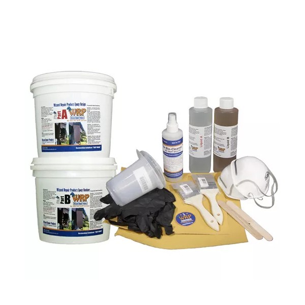 Wizzard Repair Products Small Basic Kit Plus (WRP-SM-PLUS): Equal parts of Part A resin dough (brown) and Part B hardener dough (white) along with Part A and B Liquids. Coverage is approx. 3/4 of a square foot 1/4 of an inch thick. Also includes Accessory Kit. Approximately 32 oz. by volume plus Accessory Kit.