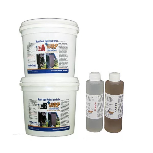 Wizzard Repair Products Small Basic Kit (WRP-SM-KT): Equal parts of Part A resin dough (brown) and Part B hardener dough (white) along with Part A and B Liquids. Coverage is approx. 3/4 of a square foot 1/4 of an inch thick. Approx 32 oz. by volume.