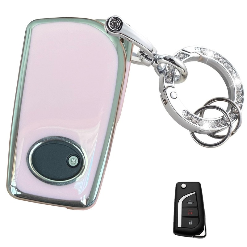 WKEDQAF Key Fob Cover for Toyota Fortuner Tundra Camry RAV4 Challenger Replacement for Keyless Entry Remote Key Shell with Keychain (3-Button-Silver-Pink)