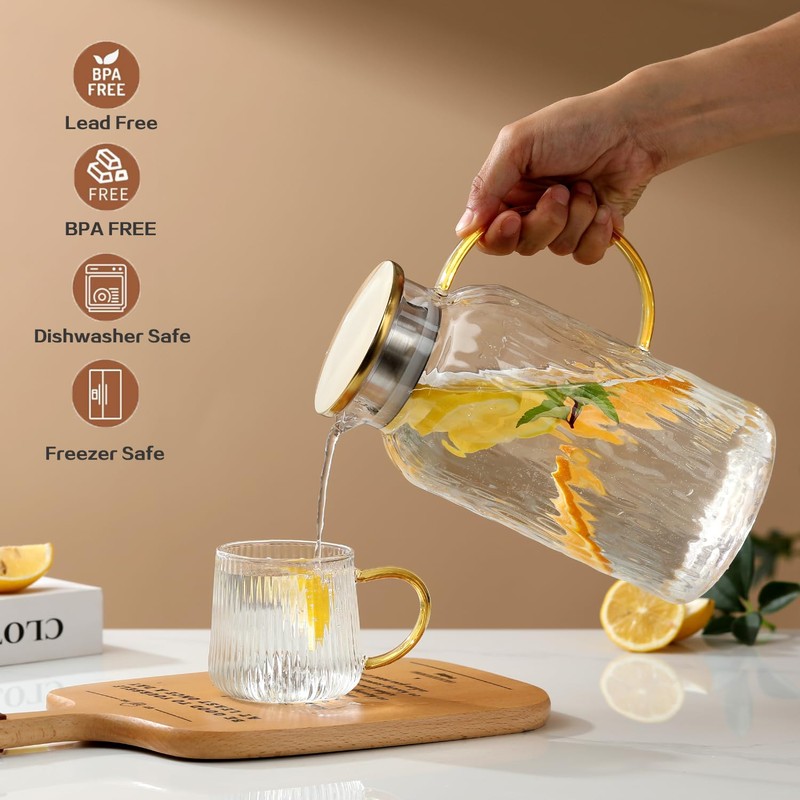 - 【QUALITY MATERIAL】:Heat resistant glass pitcher with lid is crafted from high borosilicate glass,it able to withstand temperatures ranging from -20°C to 150°C (-4°F to 302°F).It's also lead-free and BPA-free,and is safe for use in refrigerators and stoves