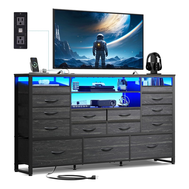 WLIVE Dresser for Bedroom with 15 Fabric Drawers & Adjustable Shelves, Dresser TV Stand with Led Light & Charging Station, Chest of Drawers for Living Room, Charcoal Black Wood Grain Print (65'' TV)