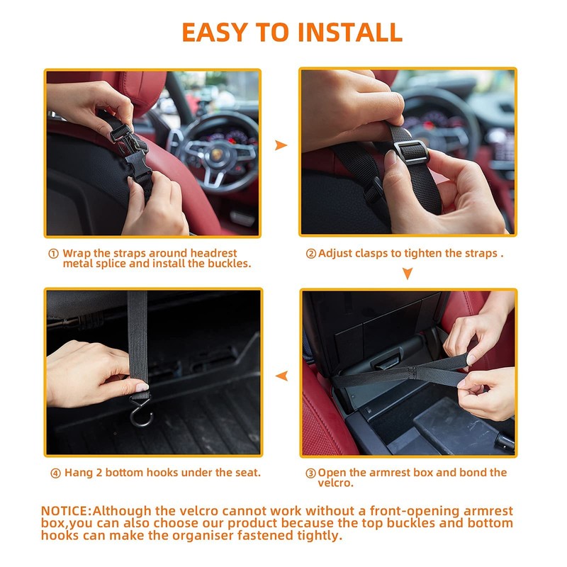 • 【Easy to Install】Just put 2 buckles, 2 hooks with elastic and 1 HOOK & LOOP are fixed in the corresponding position, don't need to struggle with any bolts, screws and suction cups, prevent that in the case of bumps items will fall. Car handbag holder can be applied to all models of car