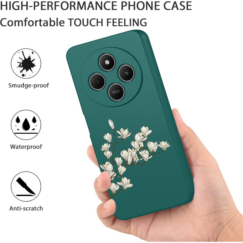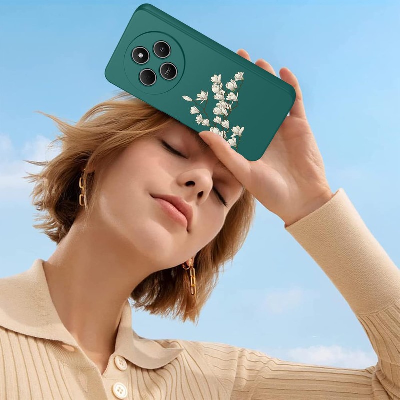 WLNYQF for Xiaomi Redmi 14C / Poco C75 4G Case - Liquid Silicone Magnolia Pattern TPU Smooth Gel Protective Case with Camera Protection, Shockproof Shell, and Microfiber Lining, Dark Green
