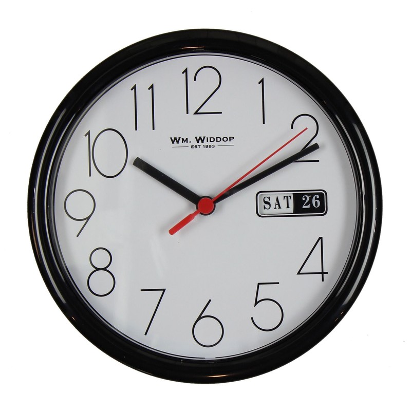 Wm.Widdop Day/Date Wall Clk-Black Case White Dial 8.5"Rnd