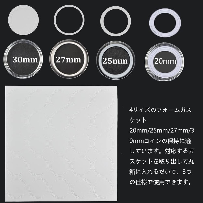 - パッケージ内容:1 x プラスチックボックス。 100 x 透明プラスチックラウンドコイン収納ボックス。 100 x ガスケット(20mm、25mm、27mm、30mm)、多くのコインを保管するのに十分です。