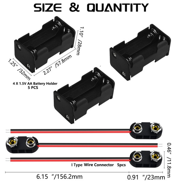 - Package Content: 5 * 4-slots 1.5V AA Battery Holder + 5 * 9V T Type Snap Connector.
